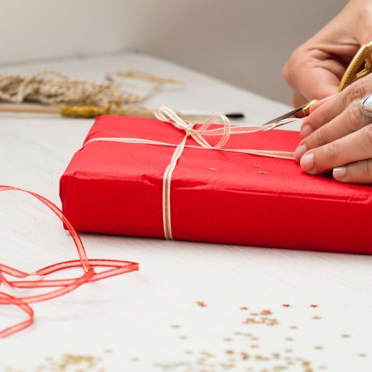 Если вы упаковываете подарок без коробки, попробуйте метод «конфеты»: расположите предмет в центре плёнки, соберите края вверх и перевяжите лентой или джутовой нитью. Такой способ особенно хорош для мягких подарков и наборов из нескольких предметов.